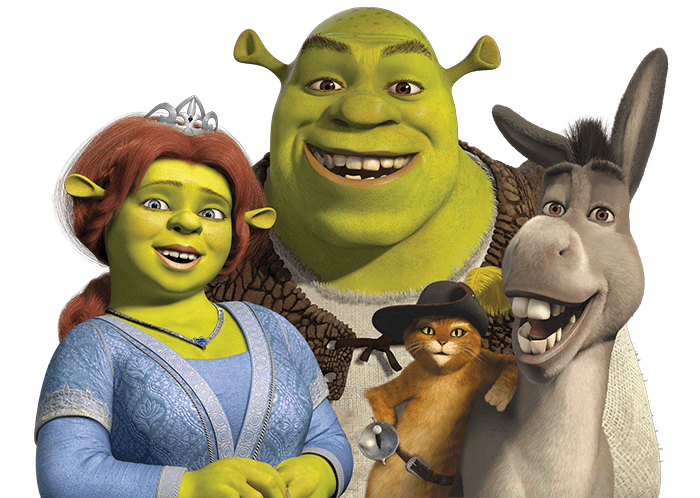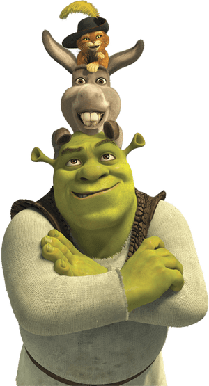 - Шрэк (Майк Майерс). Зеленый великан огр, живущий на своем болоте и не привечающий незваных гостей. Вынужден отправиться на спасение принцессы Фионы, на которой позже женился.